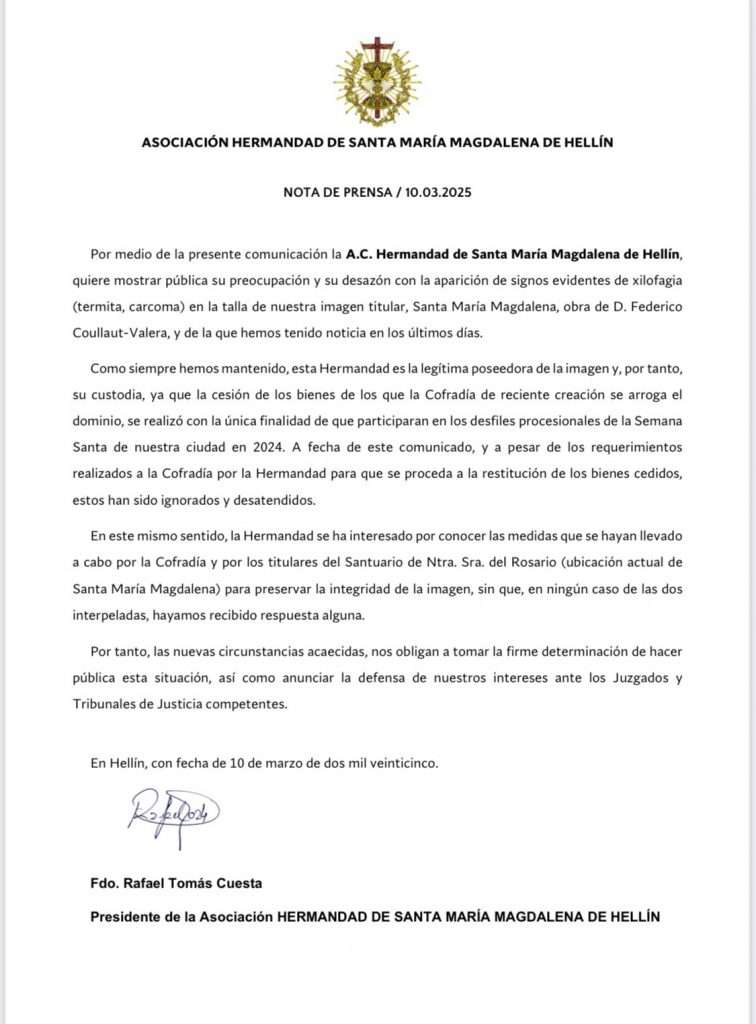 El comunicado está firmado por el Presidente de la Presidente de la Asociación Hermandad de Santa María Magdalena de Hellín, Rafael Tomás, termina anunciando que llevarán la defensa de sus intereses “ante los Juzgados y Tribunales de Justicia competentes”.